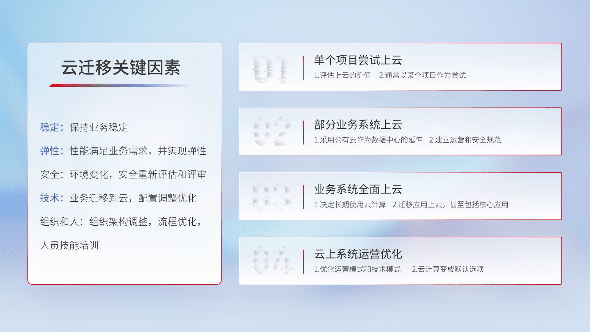 结合实际业务,,从规划设计、、云平台选型、、云原生改造、、数据迁移、、、、集成交付,,,迁移全过程为客户识别最佳上云路径,,,做好风险识别管理,,,设计网络架构、、身份权限、、、安全审计合规、、操作审计、、、、日志审计、、监控告警策略、、、多站点容灾设计等,,,,对云上基础设施进行整体规划,,提升IT治理水平,,,以满足弹性、、高可用、、、、高性能的需求。。