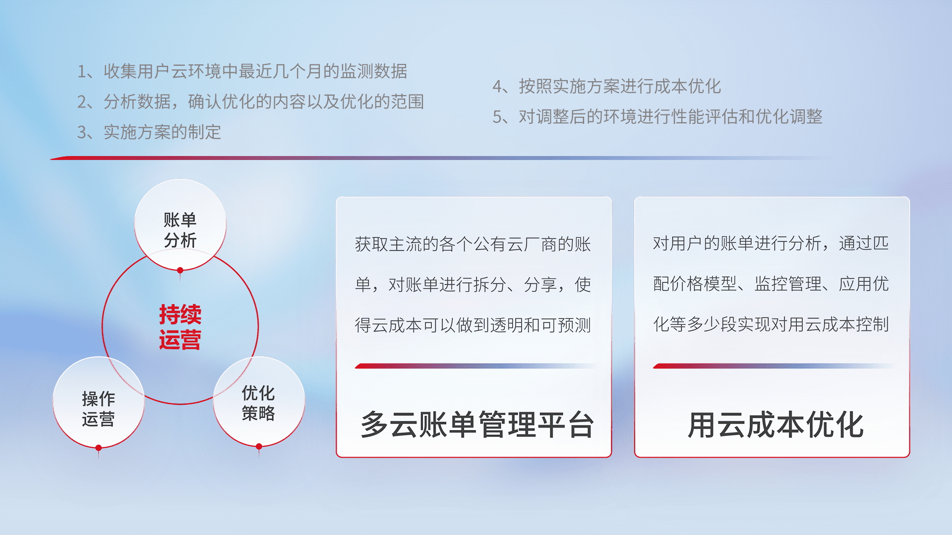 通过多云纳管,,,,以统一的资源数据模型把客户的云资源进行抽象和封装,,,,进而实现对多云资源的统一操作,,,保障云资源管理的可靠性、、稳定性与可用性。。。量身定制化运维内容,,,,配置、、、、开发运维、、、、补丁管理、、、、备份、、、监控、、、、认证和访问管理、、、、审计和日常巡检等,,保障在用云过程中的可靠度,,稳定度以及高可用率。。